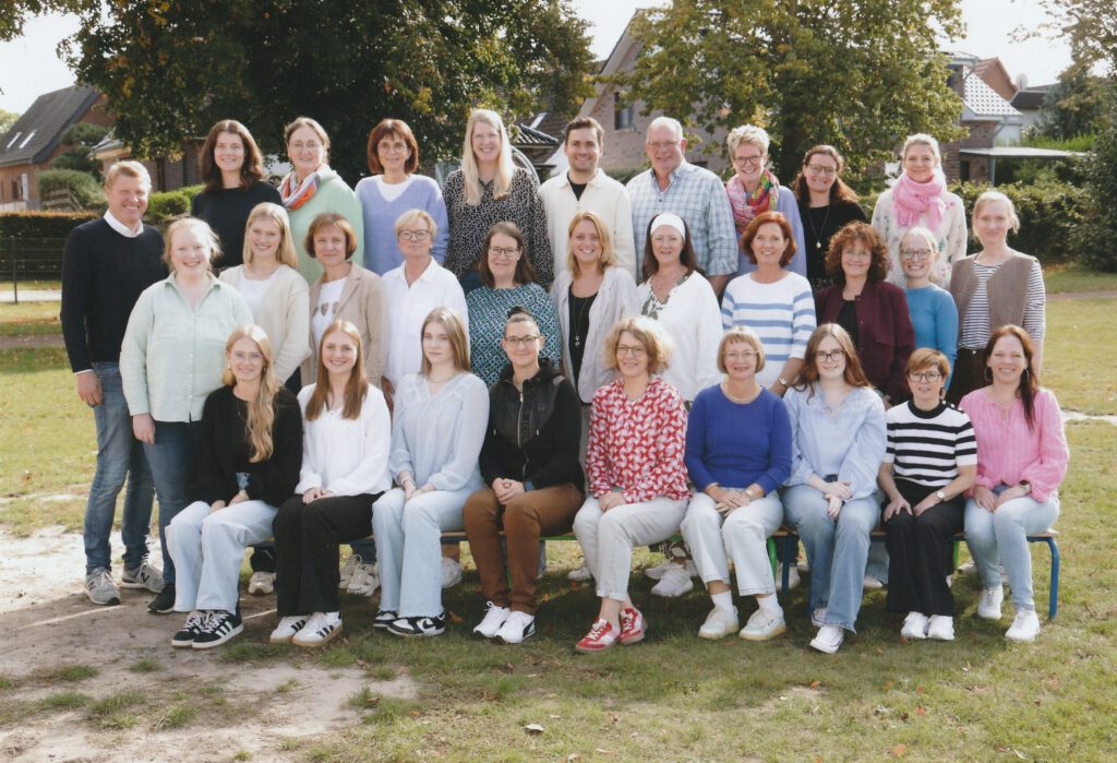 Mittlere Reihe: P. Hülsmann, L. Idasiak (päd. Mitarb.), C. Albers (päd. Mitarb.), G. Römer, J. Plagemann, K. Schiltmeyer, L. Hörnschemeyer, E. Olthaus-Hollmann, S. Rießelmann, S. Haskamp (Schulsozialarbeiterin), A. Deters (Anwärterin), M. Haskamp