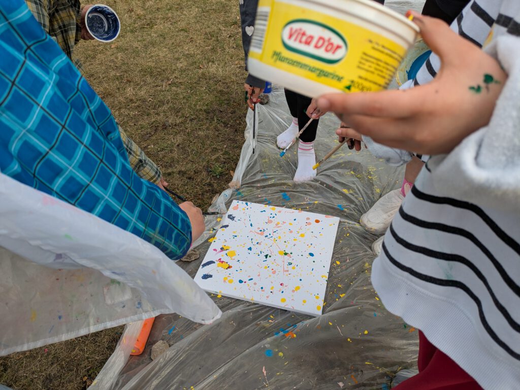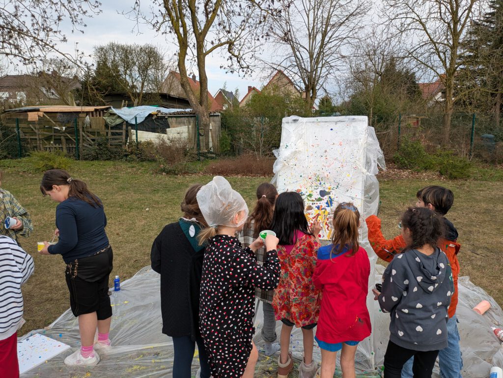 Besonders viel Spaß machte aber das gemeinsame Gestalten der Bilder beim „Action Painting“. Dabei bekamen nicht nur die Bilder Farbe ab 😉.